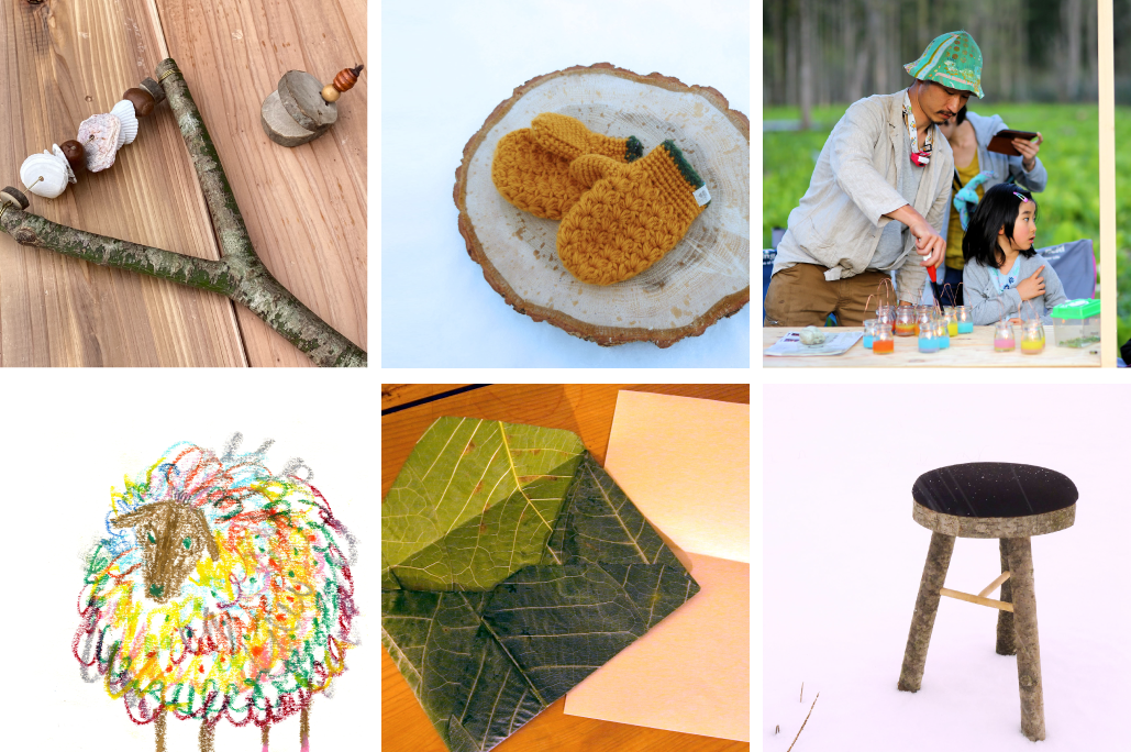 企画に合わせて、ものづくりや工作のワークショップもしています。枝や木の実・葉っぱや石ころ。そんな身の回りに転がっている素材をよく観ると、楽しい発見がいっぱいあります。